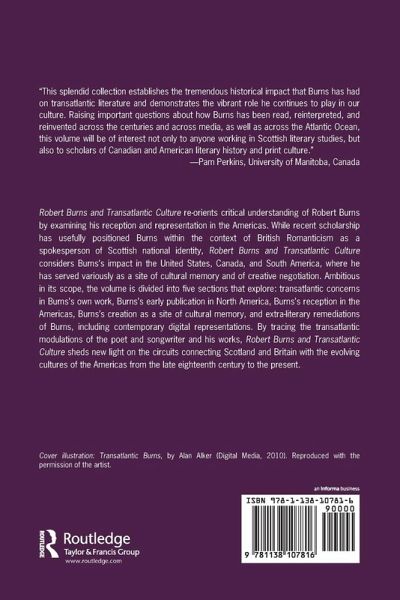 While recent scholarship has usefully positioned Burns within the context of British Romanticism as a spokesperson of Scottish national identity, Robert Burns and Transatlantic Culture considers Burns's impact in the United States, Canada, and South America, where he has served variously as a site of cultural memory and of creative negotiation. Ambitious in its scope, the volume is divided into five sections that explore: transatlantic concerns in Burns's own work, Burns's early publication in North America, Burns's reception in the Americas, Burns's creation as a site of cultural memory, and extra-literary remediations of Burns, including contemporary digital representations. By tracing the transatlantic modulations of the poet and songwriter and his works, Robert Burns and Transatlantic Culture sheds new light on the circuits connecting Scotland and Britain with the evolving cultures of the Americas from the late eighteenth century to the present.