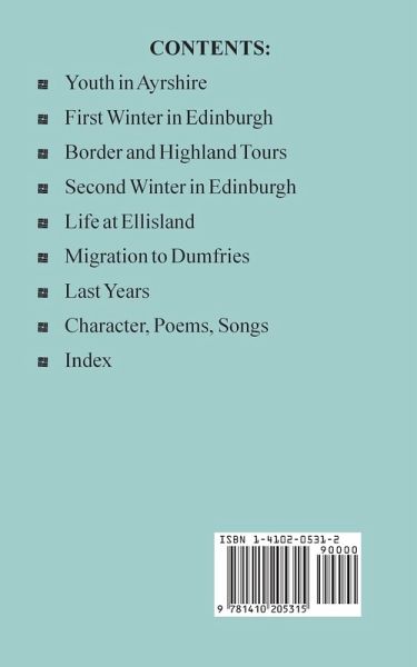 CONTENTS: Youth in Ayrshire First Winter in Edinburgh Border and Highland Tours Second Winter in Edinburgh Life at Ellisland Migration to Dumfries Last Years Character, Poems, Songs Index