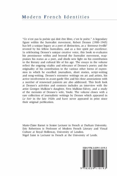 Contents: Marie-Claire Barnet/Eric Robertson/Nigel Saint: Introduction - Roger Cardinal: The Diary of an Apparition - Michael G. Kelly : Pureté de l'impur. Robert Desnos et Le Grand Jeu - Philippe Met : « SÉLAVY (Rrose) ou c'est la viscérose » : Desnos selon Leiris, ou la voie/x de son maître ? - Andrew Rothwell : 'Robert Desnos parle surréaliste à volonté' - Georgiana M.M. Colvile: Éros, Hypnos et Thanatos : The Night of Loveless Nights (1927-1930) - Mary Ann Caws: The Destiny of Robert Desnos - Katharine Conley: Against the Grain: tracing Desnos's Contrée in Pétain's France - Marie-Claire Dumas : Belle Angleterre de légendes - Adelaide Russo: Robert Desnos's 'Gymnastics' - Jonathan Eburne: On Murder, Considered as one of the Surrealist Arts: Robert Desnos in the shadow of Jack the Ripper - Marie-Claire Barnet : Les Voix de la sirène : bavardage, tatouage, et décalcomanie - Renée Riese Hubert : Robert Desnos rhabillé par ses illustrateurs, même - Elza Adamowicz: Desnos's Writings on Art: Beyond the Exotic? - Ramona Fotiade: Automatism and the Moving Image: from verbal to visual metaphor in L'Étoile de mer - Fern Malkine-Falvey: Robert Desnos and Georges Malkine: some recollections.Contents: Marie-Claire Barnet/Eric Robertson/Nigel Saint: Introduction - Roger Cardinal: The Diary of an Apparition - Michael G. Kelly : Pureté de l'impur. Robert Desnos et Le Grand Jeu - Philippe Met : " SÉLAVY (Rrose) ou c'est la viscérose " : Desnos selon Leiris, ou la voie/x de son maître ? - Andrew Rothwell : 'Robert Desnos parle surréaliste à volonté' - Georgiana M.M. Colvile: Éros, Hypnos et Thanatos : The Night of Loveless Nights (1927-1930) - Mary Ann Caws: The Destiny of Robert Desnos - Katharine Conley: Against the Grain: tracing Desnos's Contrée in Pétain's France - Marie-Claire Dumas : Belle Angleterre de légendes - Adelaide Russo: Robert Desnos's 'Gymnastics' - Jonathan Eburne: On Murder, Considered as one of the Surrealist Arts: Robert Desnos in the shadow of Jack the Ripper - Marie-Claire Barnet : Les Voix de la sirène : bavardage, tatouage, et décalcomanie - Renée Riese Hubert : Robert Desnos rhabillé par ses illustrateurs, même - Elza Adamowicz: Desnos's Writings on Art: Beyond the Exotic? - Ramona Fotiade: Automatism and the Moving Image: from verbal to visual metaphor in L'Étoile de mer - Fern Malkine-Falvey: Robert Desnos and Georges Malkine: some recollections.