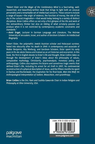 Robert Eisler, the polymathic Jewish Austrian scholar and Holocaust survivor, faded into obscurity after his death in 1949. A contemporary and associate of Walter Benjamin, Aby Warburg, and Gershom Scholem, Eisler spent his early years in fin-de-siècle Vienna and trained as an art historian and economist. In this book, the first in English devoted to Eisler's life and thought, Brian Collins takes us through the development of Eisler's ideas about the philosophy of values, comparative mythology, Christianity, psychoanalysis, monetary policy, and anthropology. Collins also explores the bizarre and sometimes tragic events that defined Eisler's life, including his arrest for art theft in 1907, his controversial reconstruction of a physical description of Jesus, and the fifteen months he spent in Dachau and Buchenwald, the inspiration for his final book, Man into Wolf: An Anthropological Interpretation of Sadism, Masochism, and Lycanthropy.