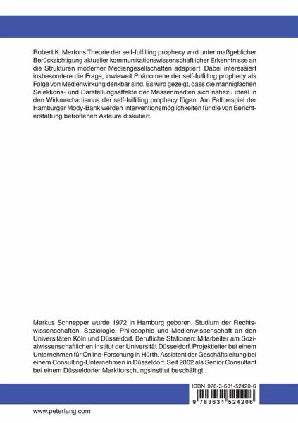 Robert K. Mertons Theorie der self-fulfilling prophecy wird unter maßgeblicher Berücksichtigung aktueller kommunikationswissenschaftlicher Erkenntnisse an die Strukturen moderner Mediengesellschaften adaptiert. Dabei interessiert insbesondere die Frage, inwieweit Phänomene der self-fulfilling prophecy als Folge von Medienwirkung denkbar sind. Es wird gezeigt, dass die mannigfachen Selektions- und Darstellungseffekte der Massenmedien sich nahezu ideal in den Wirkmechanismus der self-fulfilling prophecy fügen. Am Fallbeispiel der Hamburger Mody-Bank werden Interventionsmöglichkeiten für die von Berichterstattung betroffenen Akteure diskutiert.