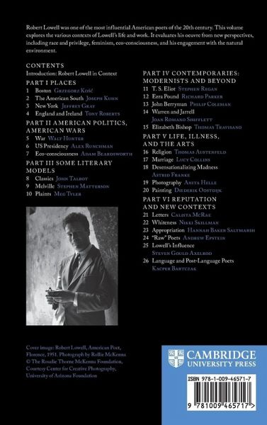 Contributors Acknowledgements Abbreviations Introduction. Robert Lowell in Context Part I. Places: 1. Boston Grzegorz Kosc 2. The American south Joseph Kuhn 3. New York Jeffrey Gray 4. England and Ireland Tony Roberts Part II. American Politics, American Wars: 5. War Walt Hunter 6. US presidency Alex Runchman 7. Ecoconsciousness Adam Beardsworth Part III. Some Literary Models: 8. Classics John Talbot 9. Melville Stephen Matterson 10. Plaints Meg Tyler Part IV. Contemporaries: Modernists and Beyond: 11. T. S. Eliot Stephen Regan 12. Ezra pound Richard Parker 13. John Berryman Philip Coleman 14. Warren and Jarrell Joan Romano Shifflett 15. Elizabeth Bishop Thomas Travisano Part V. Life, Illness, and the Arts: 16. Religion Thomas Austenfeld 17. Marriage Lucy Collins 18. Desensationalizing madness Astrid Franke 19. Photography Anita Helle 20. Painting Diederik Oostdijk Part VI. Reputation and New Contexts: 21. Letters Calista McRae 22. Whiteness Nikki Skillman 23. Appropriation Hannah Baker Saltmarsh 24. 'Raw' poets Andrew Epstein 25. Lowell's influence Steven Gould Axelrod 26. Language and post-language poets Kacper Bartczak Further reading Index.