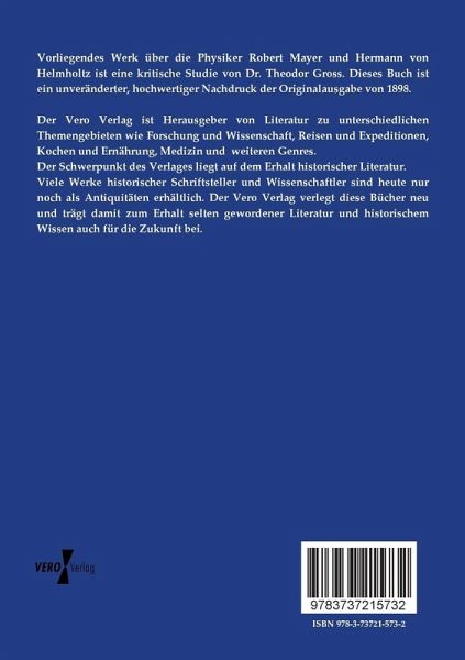 Vorliegendes Werk über die Physiker Robert Mayer und Hermann von Helmholtz ist eine kritische Studie von Dr. Theodor Gross. Dieses Buch ist ein unveränderter, hochwertiger Nachdruck der Originalausgabe von 1898.