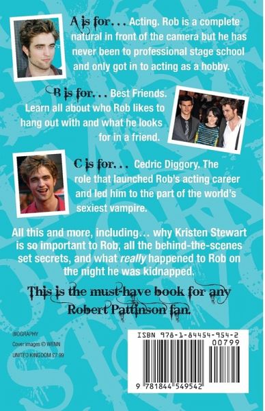 A is for ...acting. Rob is a complete natural in front of the camera but he has never been to professional stage school and only got into acting as a hobby. B is for ...Best Friends. Learn all about who Rob likes to hang out with and what he looks for in a friend. C is for ...Cedric Diggory. The role that launched Rob's acting career and led him to the part of the world's sexiest vampire. All this and more, including...why Kristen Stewart is so important to Rob, all the behind-the-scenes set secrets, and what really happened to Rob on the night he was kidnapped.
