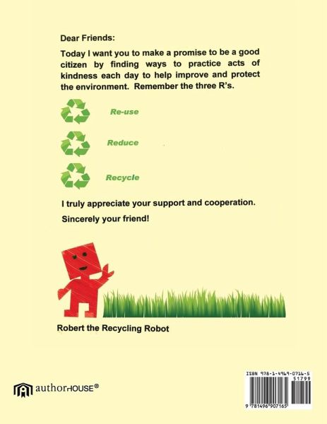 "Robert the Recycling Robot" came into fruition as the author was working on her master's degree in education during her Art and Visual Inquiry class. The major visual art project was to write and illustrate a children's picture book addressing an issue of your choice from a variety of topics. The colorful red character "Robert" was created for children to follow as they read teaching them simple steps to recycle, utilizing the 3R's (reuse, reduce, and recycle). One of the main criteria's' were to have original artwork and story line, consistent style, and effective and attractive presentation. During the class the author was exposed to the style of Eric Carle's book that attracted some of her art techniques. During the author's research it was discovered it was literature for adults to read, but little for children that would allow them to visually see and understand the importance of recycling. The author hopes this whimsical character will make such an impression on children that they will want to commit and assist in saving the environment in their childhood, and not wait until they are adults to begin the recycling process. This is Volume I of future translation into diverse languages, because recycling is globally worldwide. "Robert the Recycling Robot" will be traveling into various areas to encourage the community worldwide, and students in public and private venues to recycle.