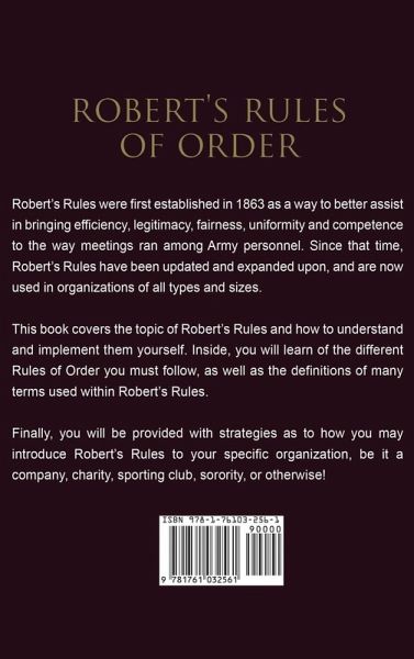 ROBERT'S RULES OF ORDER Robert’s Rules were first established in 1863 as a way to better assist in bringing efficiency, legitimacy, fairness, uniformity and competence to the way meetings ran among Army personnel. Since that time, Robert’s Rules have been updated and expanded upon, and are now used in organizations of all types and sizes. This book covers the topic of Robert’s Rules and how to understand and implement them yourself. Inside, you will learn of the different Rules of Order you must follow, as well as the definitions of many terms used within Robert’s Rules. Finally, you will be provided with strategies as to how you may introduce Robert’s Rules to your specific organization, be it a company, charity, sporting club, sorority, or otherwise! Here Is What's Included... What Are Robert's Rules The Origin Of Robert's Rules Parliamentary Process How To Properly Run A Meeting Motions Roles Within The Deliberative Body How To Begin Using Robert's Rules Much, Much More!