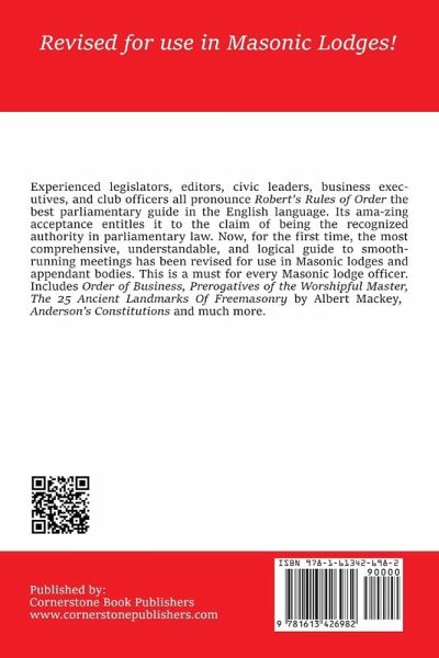 Experienced legislators, editors, civic leaders, business executives, and club officers all pronounce Robert's Rules of Order the best parliamentary guide in the English language. Its amazing acceptance entitles it to the claim of being the recognized authority in parliamentary law. Now, for the first time, the most comprehensive, understandable, and logical guide to smooth-running meetings has been revised for use in Masonic lodges and appendant bodies. This is a must for every Masonic lodge officer. Includes Order of Business, Prerogatives of the Worshipful Master, The 25 Ancient Landmarks Of Freemasonry by Albert Mackey, Anderson's Constitutions and much more.
