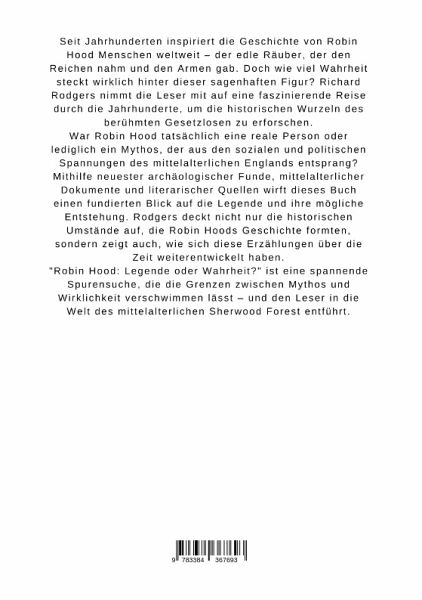 Seit Jahrhunderten inspiriert die Geschichte von Robin Hood Menschen weltweit - der edle Räuber, der den Reichen nahm und den Armen gab. Doch wie viel Wahrheit steckt wirklich hinter dieser sagenhaften Figur? Richard Rodgers nimmt die Leser mit auf eine faszinierende Reise durch die Jahrhunderte, um die historischen Wurzeln des berühmten Gesetzlosen zu erforschen.War Robin Hood tatsächlich eine reale Person oder lediglich ein Mythos, der aus den sozialen und politischen Spannungen des mittelalterlichen Englands entsprang? Mithilfe neuester archäologischer Funde, mittelalterlicher Dokumente und literarischer Quellen wirft dieses Buch einen fundierten Blick auf die Legende und ihre mögliche Entstehung. Rodgers deckt nicht nur die historischen Umstände auf, die Robin Hoods Geschichte formten, sondern zeigt auch, wie sich diese Erzählungen über die Zeit weiterentwickelt haben."Robin Hood: Legende oder Wahrheit?" ist eine spannende Spurensuche, die die Grenzen zwischen Mythos und Wirklichkeit verschwimmen lässt - und den Leser in die Welt des mittelalterlichen Sherwood Forest entführt.