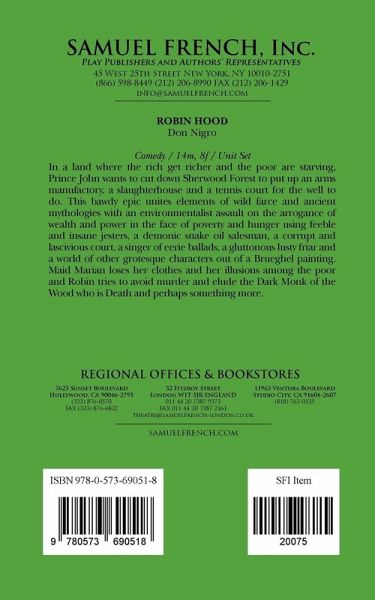 Comedy Characters: 14 male, 8 female (more if desired.) Unit set. In a land where the rich get richer and the poor are starving, Prince John wants to cut down Sherwood Forest to put up an arms manufactory, a slaughterhouse and a tennis court for the well to do. This bawdy epic unites elements of wild farce and ancient mythologies with an environmentalist assault on the arrogance of wealth and power in the face of poverty and hunger using feeble and insane jesters, a demonic
