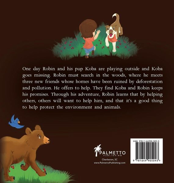 Robin and Koba are best friends who love playing outside. Robin gets distracted and Koba goes missing. In his search for Koba, Robin walks through the forest. He hears Birdy chirping and asks what's wrong. Birdy explains that his tree home is no longer there due to deforestation. Robin says he'll help restore his home and offers to let him stay at his house. Grateful, Birdy helps Robin find Koba. Then Robin hears Froggy croaking and asks him what's wrong. Froggy feels sick because the lake is polluted with garbage due to people littering. Robin says he'll help fix Froggy's lake home and offers to let him stay at his house, too. Froggy also helps to find Koba. As the new friends continue walking, they come across a bear, Teddy, attempting to climb a tree so he can get some honey from a beehive. But the branch is too high to reach. Robin explains that there are alternative food sources, and shows him where to find them. Teddy joins the new friends and they all continue to search. Suddenly they hear Koba barking. It turns out Koba had followed a family of butterflies and gotten lost. After their joyful reunion, Robin keeps the promises he'd made to his new friends and they all happily followed him back to his house. Through his adventure, Robin learned that by helping others, others will want to help him, and that it's a good thing to help protect the environment and animals.