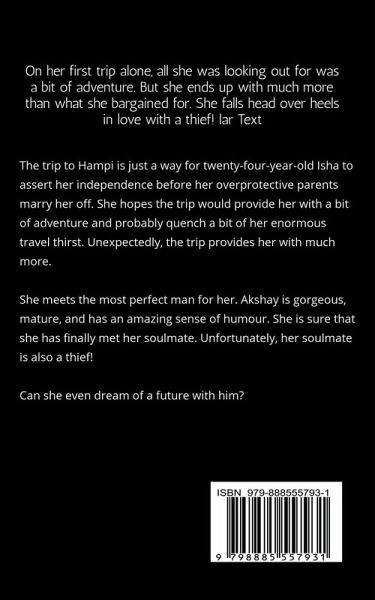 On her first trip alone, all she was looking out for was a bit of adventure. But she ends up with much more than what she bargained for. She falls head over heels in love with a thief! The trip to Hampi is just a way for twenty-four-year-old Isha to assert her independence before her overprotective parents marry her off. She hopes the trip would provide her with a bit of adventure and probably quench a bit of her enormous travel thirst. Unexpectedly, the trip provides her with much more. She meets the most perfect man for her. Akshay is gorgeous, mature, and has an amazing sense of humour. She is sure that she has finally met her soulmate. Unfortunately, her soulmate is also a thief! Can she even dream of a future with him?