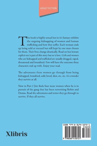 This book is highly sexual but in it's fantasy exhibits the ongoing kidnapping of women and human trafficking and how they suffer. Each woman ends up being sold or rescued but still kept by one man chosen for them. Their lives change drastically. Read on but beware explicit sex is part of this story but so is love. Girls and women who are kidnapped and trafficked are usually drugged, raped, threatened and brutalized. Few will have the outcome these characters end up with. Enjoy your read. The adventures these women go through from being kidnapped, brutalized, sold, loved, shot, etc. etc. it's a wonder they survive at all. Now in Part 2 Jim finds four more women when he is in pursuit of the gang that has been terrorizing Robin and Donna. Read the adventures and terror they go through to survive. If they all survive.