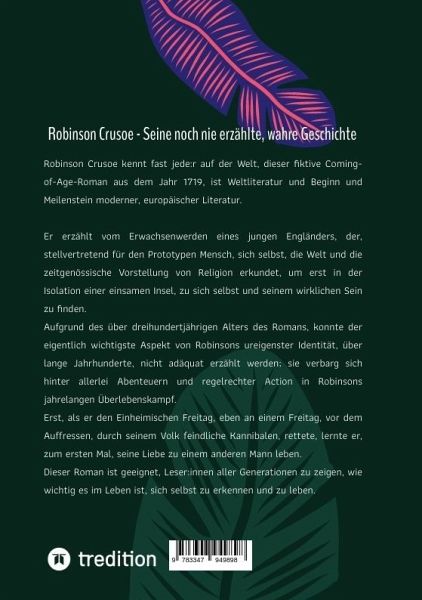 Robinson Crusoe kennt fast jede:r auf der Welt, dieser fiktive Coming-of-Age-Roman aus dem Jahr 1719, ist Weltliteratur und Beginn und Meilenstein moderner, europäischer Literatur.Er erzählt vom Erwachsenwerden eines jungen Engländers, der, stellvertretend für den Prototypen Mensch, sich selbst, die Welt und die zeitgenössische Vorstellung von Religion erkundet, um erst in der Isolation einer einsamen Insel, zu sich selbst und seinem wirklichen Sein zu finden.Aufgrund des über dreihundertjährigen Alters des Romans, konnte der eigentlich wichtigste Aspekt von Robinsons ureigenster Identität, über lange Jahrhunderte, nicht adäquat erzählt werden; sie verbarg sich hinter allerlei Abenteuern und regelrechter Action, in Robinsons jahrelangem Überlebenskampf.Erst, als er den Einheimischen Freitag, eben an einem Freitag, vor dem Auffressen durch seinem Volk feindliche Kannibalen rettete, lernte er, zum ersten Mal, seine Liebe zu einem anderen Mann zu leben.Dieser Roman ist geeignet, Leser:innen aller Generationen zu zeigen, wie wichtig es im Leben ist, sich selbst zu erkennen und zu leben.