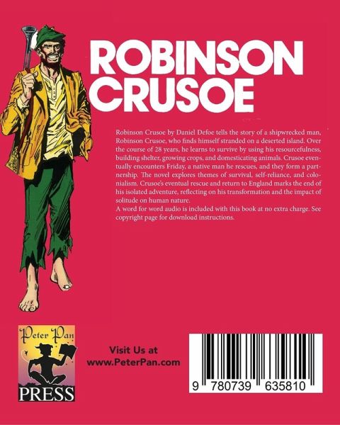 Robinson Crusoe by Daniel Defoe tells the story of a shipwrecked man, Robinson Crusoe, who finds himself stranded on a deserted island. Over the course of 28 years, he learns to survive by using his resourcefulness, building shelter, growing crops, and domesticating animals. Crusoe eventually encounters Friday, a native man he rescues, and they form a partnership. The novel explores themes of survival, self-reliance, and colonialism. Crusoe's eventual rescue and return to England marks the end of his isolated adventure, reflecting on his transformation and the impact of solitude on human nature. A word for word audio is included with this book at no extra charge. See copyright page for download instructions.