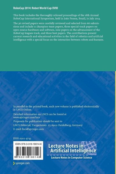 This book includes the thoroughly refereed proceedings of the 18th Annual RoboCup International Symposium, held in Joao Pessoa, Brazil, in July 2014.The 36 revised papers were carefully reviewed and selected from 66 submissions and include 11 champion-team papers, three special-track papers on open-source hardware and software, nine papers on the advancement of the RoboCup leagues track, and three best papers. The contributions present current research and educational activities in the field of robotics and artificial intelligence with a special focus on the interaction between robots and humans.