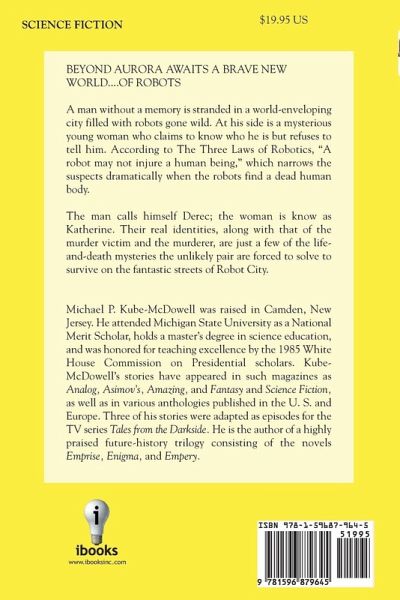 BEYOND AURORA AWAITS A BRAVE NEW WORLD....OF ROBOTS A man without a memory is stranded in a world-enveloping city filled with robots gone wild. At his side is a mysterious young woman who claims to know who he is but refuses to tell him. According to The Three Laws of Robotics,"A robot may not injure a human being," which narrows the suspects dramatically when the robots find a dead human body. The man calls himself Derec; the woman is know as Katherine. Their real identities, along with that of the murder victim and the murderer, are just a few of the life-and-death mysteries the unlikely pair are forced to solve to survive on the fantastic streets of Robot City. Michael P. Kube-McDowell was raised in Camden, New Jersey. He attended Michigan State University as a National Merit Scholar, holds a master's degree in science education, and was honored for teaching excellence by the 1985 White House Commission on Presidential scholars. Kube-McDowell's stories have appeared in such magazines as Analog, Asimov's, Amazing, and Fantasy and Science Fiction, as well as in various anthologies published in the U. S. and Europe. Three of his stories were adapted as episodes for the TV series Tales from the Darkside. He is the author of a highly praised future-history trilogy consisting of the novels Emprise, Enigma, and Empery.