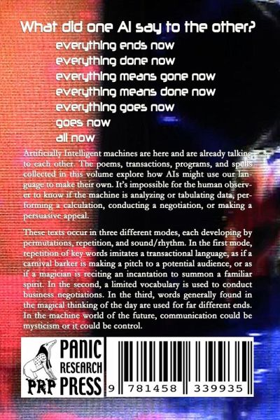Artificially Intelligent machines are here and are already talking to each other. The poems, transactions, programs, and spells collected in this volume explore how AIs might use our language to make their own. It's impossible for the human observer to know if the machine is analyzing or tabulating data, performing a calculation, conducting a negotiation, or making a persuasive appeal. These texts occur in three different modes, each developing by permutations, repetition, and sound/rhythm. In the first mode, repetition of key words imitates a transactional language, as if a carnival barker is making a pitch to a potential audience, or as if a magician is reciting an incantation to summon a familiar spirit. In the second, a limited vocabulary is used as a transactional language. In the third, words generally found in the magical thinking of the day are used for far different ends. In the machine world of the future, communication could be mysticism or it could be control.