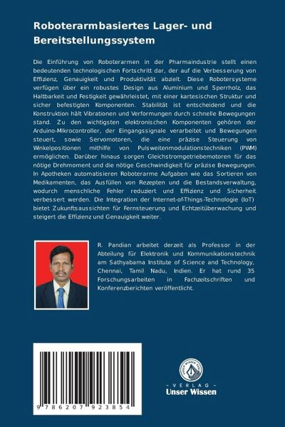 Die Einführung von Roboterarmen in der Pharmaindustrie stellt einen bedeutenden technologischen Fortschritt dar, der auf die Verbesserung von Effizienz, Genauigkeit und Produktivität abzielt. Diese Robotersysteme verfügen über ein robustes Design aus Aluminium und Sperrholz, das Haltbarkeit und Festigkeit gewährleistet, mit einer kartesischen Struktur und sicher befestigten Komponenten. Stabilität ist entscheidend und die Konstruktion hält Vibrationen und Verformungen durch schnelle Bewegungen stand. Zu den wichtigsten elektronischen Komponenten gehören der Arduino-Mikrocontroller, der Eingangssignale verarbeitet und Bewegungen steuert, sowie Servomotoren, die eine präzise Steuerung von Winkelpositionen mithilfe von Pulsweitenmodulationstechniken (PWM) ermöglichen. Darüber hinaus sorgen Gleichstromgetriebemotoren für das nötige Drehmoment und die nötige Geschwindigkeit für präzise Bewegungen. In Apotheken automatisieren Roboterarme Aufgaben wie das Sortieren von Medikamenten, dasAusfüllen von Rezepten und die Bestandsverwaltung, wodurch menschliche Fehler reduziert und Effizienz und Sicherheit verbessert werden. Die Integration der Internet-of-Things-Technologie (IoT) bietet Zukunftsaussichten für Fernsteuerung und Echtzeitüberwachung und steigert die Effizienz und Genauigkeit weiter.