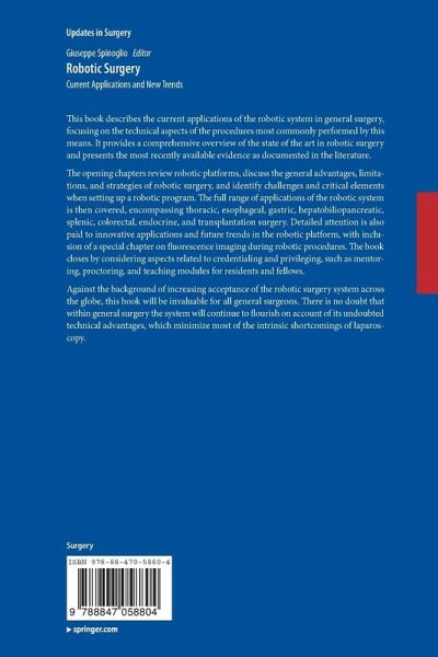 This book describes the current applications of the robotic system in general surgery, focusing on the technical aspects of the procedures most commonly performed by this means. It provides a comprehensive overview of the state of the art in robotic surgery and presents the most recently available evidence as documented in the literature. The opening chapters review robotic platforms, discuss the general advantages, limitations, and strategies of robotic surgery, and identify challenges and critical elements when setting up a robotic program. The full range of applications of the robotic system is then covered, encompassing thoracic, esophageal, gastric, hepatobiliopancreatic, splenic, colorectal, endocrine, and transplantation surgery. Detailed attention is also paid to innovative applications and future trends in the robotic platform, with inclusion of a special chapter on fluorescence imaging during robotic procedures. The book closes by considering aspects related to credentialing and privileging, such as mentoring, proctoring, and teaching modules for residents and fellows. Against the background of increasing acceptance of the robotic surgery system across the globe, this book will be invaluable for all general surgeons. There is no doubt that within general surgery the system will continue to flourish on account of its undoubted technical advantages, which minimize most of the intrinsic shortcomings of laparoscopy.
