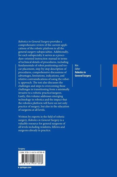 Robotics in General Surgery provides a comprehensive review of the current applications of the robotic platform in all the general surgery subspecialties. Additionally, for each subspecialty it serves as a procedure-oriented instruction manual in terms of technical details of procedures, including fundamentals of robot positioning and trocar placement, step-by-step description of procedures, comprehensive discussions of advantages, limitations, indications, and relative contraindications of using the robotic approach. The text also discusses the challenges and steps to overcoming these challenges in transitioning from a minimally invasive to a robotic practice/surgeon. Lastly, this volume addresses emerging technology in robotics and the impact that the robotics platform will have on not only practice of surgery, but also in the education of surgeons at all levels.