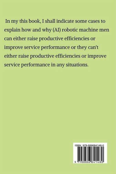 Nowadays, artificial intelligent robotic technology which is one kind of popular tool to help workers to work in factories or offices or serve clients in restaurants or shopping centers. It brings this question: Can artificial intelligent robotic machine men assist workers to raise productive efficiencies or improve service performance? If one factory or one office only applies artificial intelligent robotic machine men to replace human labors to help its different departments to do any tasks, whether can its (AI) robotic machine men help them to raise productive efficiencies ? If one restaurant or one shopping center only apply (AI) robotic machine men to help to serve clients, whether can its (AI) robotic machine men help them to improve service performance? Is it better to apply half manual labors and half (AI) robotic machine men to work in one organization in order to raise productive efficiencies or improve service performance? In my this book, I shall indicate some cases to explain how and why (AI) robotic machine men can either raise productive efficiencies or improve service performance or they can't either raise productive efficiencies or improve service performance in any situations.