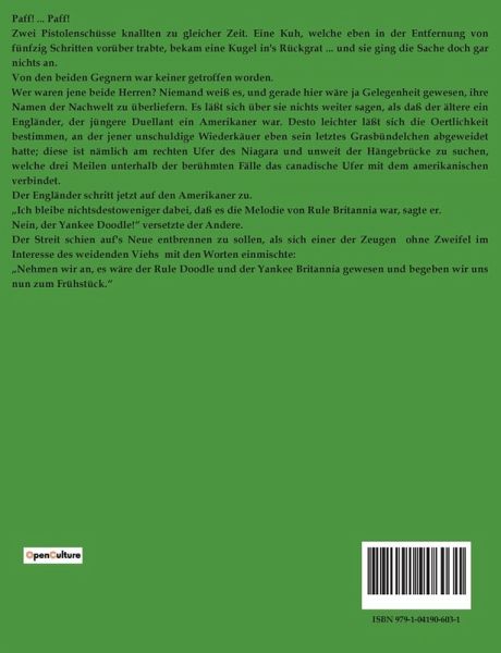 Paff! ... Paff! Zwei Pistolenschüsse knallten zu gleicher Zeit. Eine Kuh, welche eben in der Entfernung von fünfzig Schritten vorüber trabte, bekam eine Kugel in's Rückgrat ... und sie ging die Sache doch gar nichts an. Von den beiden Gegnern war keiner getroffen worden. Wer waren jene beide Herren? Niemand weiß es, und gerade hier wäre ja Gelegenheit gewesen, ihre Namen der Nachwelt zu überliefern. Es läßt sich über sie nichts weiter sagen, als daß der ältere ein Engländer, der jüngere Duellant ein Amerikaner war. Desto leichter läßt sich die Oertlichkeit bestimmen, an der jener unschuldige Wiederkäuer eben sein letztes Grasbündelchen abgeweidet hatte; diese ist nämlich am rechten Ufer des Niagara und unweit der Hängebrücke zu suchen, welche drei Meilen unterhalb der berühmten Fälle das canadische Ufer mit dem amerikanischen verbindet. Der Engländer schritt jetzt auf den Amerikaner zu. ¿Ich bleibe nichtsdestoweniger dabei, daß es die Melodie von Rule Britannia war, sagte er. Nein, der Yankee Doodle!¿ versetzte der Andere. Der Streit schien auf's Neue entbrennen zu sollen, als sich einer der Zeugen ohne Zweifel im Interesse des weidenden Viehs mit den Worten einmischte: ¿Nehmen wir an, es wäre der Rule Doodle und der Yankee Britannia gewesen und begeben wir uns nun zum Frühstück.¿
