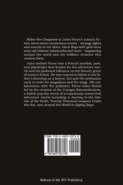 Robur the Conqueror is Jules Verne's science fiction novel about mysterious events - strange lights and sounds in the skies, black flags with gold suns atop tall historic landmarks and more - happening around the world and the brilliant inventor who creates them. Jules Gabriel Verne was a French novelist, poet, and playwright best known for his adventure novels and his profound influence on the literary genre of science fiction. He was trained to follow in his father's footsteps as a lawyer, but quit the profession early to write for magazines and the stage. His collaboration with the publisher Pierre-Jules Hetzel led to the creation of the Voyages Extraordinaires, a widely popular series of scrupulously researched adventure novels including A Journey to the Interior of the Earth, Twenty Thousand Leagues Under the Sea, and Around the World in Eighty Days.