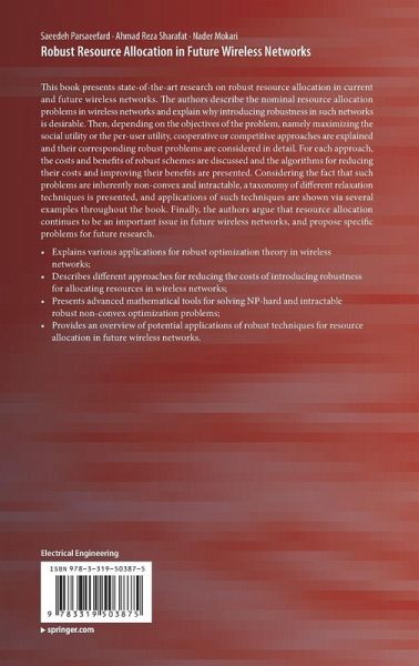 This book presents state-of-the-art research on robust resource allocation in current and future wireless networks. The authors describe the nominal resource allocation problems in wireless networks and explain why introducing robustness in such networks is desirable. Then, depending on the objectives of the problem, namely maximizing the social utility or the per-user utility, cooperative or competitive approaches are explained and their corresponding robust problems are considered in detail. For each approach, the costs and benefits of robust schemes are discussed and the algorithms for reducing their costs and improving their benefits are presented. Considering the fact that such problems are inherently non-convex and intractable, a taxonomy of different relaxation techniques is presented, and applications of such techniques are shown via several examples throughout the book. Finally, theauthors argue that resource allocation continues to be an important issue in future wireless networks, and propose specific problems for future research.
