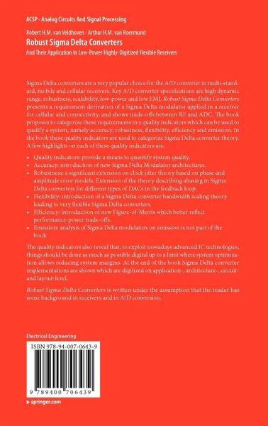 Robust Sigma-Delta Converters studies how to deal with the ever increasing requirements on IP, and how the technological advances can be exploited with the right design methodology. The book's main objective is to explore implementation possibilities of high quality Sigma-Delta modulators.Sigma Delta converters are a very popular choice for the A/D converter in multi-standard, mobile and cellular receivers. Key A/D converter specifications are high dynamic range, robustness, scalability, low-power and low EMI. Robust Sigma Delta Converters presents a requirement derivation of a Sigma Delta modulator applied in a receiver for cellular and connectivity, and shows trade-offs between RF and ADC. The book proposes to categorize these requirements in 5 quality indicators which can be used to qualify a system, namely accuracy, robustness, flexibility, efficiency and emission. In the book these quality indicators are used to categorize Sigma Delta converter theory. A few highlights on each of these quality indicators are; Quality indicators: provide a means to quantify system quality.Accuracy: introduction of new Sigma Delta Modulator architectures.Robustness: a significant extension on clock jitter theory based on phase and error amplitude error models. Extensionof the theory describing aliasing in Sigma Delta converters for different types of DACs in the feedback loop. Flexibility: introduction of a Sigma Delta converter bandwidth scaling theory leading to very flexible Sigma Delta converters. Efficiency: introduction of new Figure-of-Merits which better reflect performance-power trade-offs. Emission: analysis of Sigma Delta modulators on emission is not part of the book The quality indicators also reveal that, to exploit nowadays advanced IC technologies, things should be done as much as possible digital up to a limit where system optimization allows reducing system margins. At the end of the book Sigma Delta converter implementations are shown which are digitized on application-, architecture-, circuit- and layout-level.