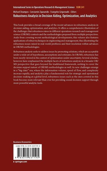 This book provides a broad coverage of the recent advances in robustness analysis in decision aiding, optimization, and analytics. It offers a comprehensive illustration of the challenges that robustness raises in different operations research and management science (OR/MS) contexts and the methodologies proposed from multiple perspectives. Aside from covering recent methodological developments, this volume also features applications of robust techniques in engineering and management, thus illustrating the robustness issues raised in real-world problems and their resolution within advances in OR/MS methodologies. Robustness analysis seeks to address issues by promoting solutions, which are acceptable under a wide set of hypotheses, assumptions and estimates. In OR/MS, robustness has been mostly viewed in the context of optimization under uncertainty. Several scholars, however, have emphasized the multiple facets of robustness analysis in a broader OR/MS perspective that goes beyond the traditional framework, seeking to cover the decision support nature of OR/MS methodologies as well. As new challenges emerge in a "big-data'" era, where the information volume, speed of flow, and complexity increase rapidly, and analytics play a fundamental role for strategic and operational decision-making at a global level, robustness issues such as the ones covered in this book become more relevant than ever for providing sound decision support through more powerful analytic tools.