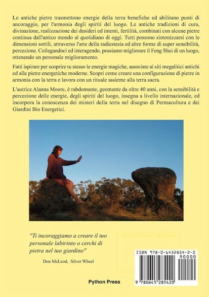 Rocce Energetiche Oggi - progettare l'armonia della Terra attraverso le composizioni di pietra. Le antiche pietre trasmettono energie della terra benefiche ed abilitano punti di ancoraggio, per l'armonia degli spiriti del luogo. Le antiche tradizioni di cura, divinazione, realizzazione dei desideri ed intenti, fertilitä, combinati con alcune pietre continua dall'antico mondo al quotidiano di oggi. Tutti possono sintonizzarsi con le dimensioni sottili, attraverso l'arte della radiestesia ed altre forme di super sensibilitä, percezione. Collegandoci ed interagendo, possiamo migliorare il Feng Shui di un luogo, ottenendo un personale miglioramento. Fatti ispirare per scoprire tu stesso le energie magiche, associate ai siti megalitici antichi ed alle pietre energetiche moderne. Scopri come creare una configurazione di pietre in armonia con la terra e lavora con un rituale assieme alla terra sacra. L'autrice Alanna Moore, e¿ rabdomante, geomante da oltre 40 anni, con la sensibilitä e percezione delle energie, degli spiriti del luogo, insegna a livello internazionale, ed incorpora la conoscenza dei misteri della terra nel disegno di Permacultura e dei Giardini Bio Energetici.