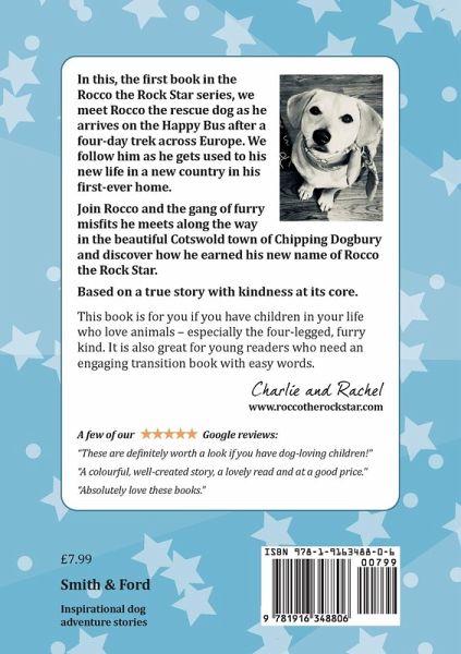 An inspirational, heartwarming early chapter book about a loveable rescue dog called Rocco, who arrives on the Happy Bus after a 4 day trek across Europe at his magical new home of Chipping Dogbury. Based on a true story we join Rocco as he deals with change and overcomes his worries and as he gains confidence he makes friends with some awesome canine characters and they go on a rocking day out together at the end of which he has earned the name of Rocco the Rock Star. Filled with excitement, laughter and love this dog adventure story starring real life rescue dog Rocco the Rock Star is fast paced, entertaining and full of original and engaging illustrations. A truly rags to riches early reader kids book from rubbish tip to rock stardom with KINDNESS at its core, this charming kids book is full of engaging characters and beautiful illustrations so is a lovely book to read with a child but it also makes an engaging first step into reading. Children's book about dogs and outdoor adventures suitable for kids up to about 11 years old and dog lovers of any age.