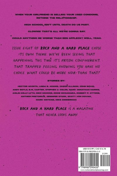 When your girlfriend is selling your used condoms, rethink the relationship. High school is until death do us part. Clowns! That's all we're gonna say. Could anything be worse than looking like Ben Affleck? Well, yeah. Issue Eight of Rock And A Hard Place chose its own theme. We've been seeing that happening. This time it's prison. Confinement. That trapped feeling. Knowing you have no choice. What could be more noir than that? With stories by: Hector Acosta, Linda B. Adams, Jason Allison, John Bovio, Andy Boyle, B.W. Carter, Stephen J. Golds, Mark Jonathan Harris, Aislin Kelly-Lyth, Mike McHone, Eddie McNamara, Robert P. Ottone, Anthea Pretorius, Jennifer Stark, Scott Von Doviak, Marc Watkins, and Mike Zimmerman. Rock And A Hard Place is the magazine that never looks away.