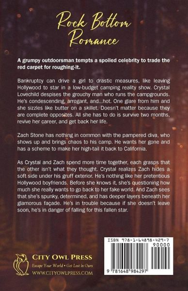 A grumpy outdoorsman tempts a spoiled celebrity to trade the red carpet for roughing-it. Bankruptcy can drive a girl to drastic measures, like leaving Hollywood to star in a low-budget camping reality show. Cystal Lovechild despises the grouchy man who runs the campgrounds. He's condescending, arrogant, and...hot. One glare from him and she sizzles like butter on a skillet. Doesn't matter because they are complete opposites. All she has to do is survive two months, revive her career, and get back her life. Zach Stone has nothing in common with the pampered diva, who shows up and brings chaos to his camp. He wants her gone and has a scheme to make her high-tail it back to California. As Crystal and Zach spend more time together, each grasps that the other isn't what they thought. Crystal realizes Zach hides a soft side under his gruff exterior. He's nothing like her pretentious Hollywood boyfriends. Before she knows it, she's questioning how much she really wants to go back to her fake world. And Zach sees that she's spunky, determined, and has deeper layers beneath her glamorous façade. He's in trouble because if she doesn't leave soon, he's in danger of falling for this fallen star.