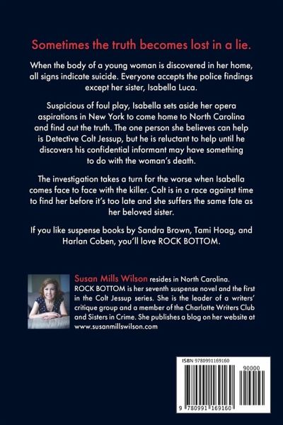 Sometimes the truth gets lost in a lie. When the body of a young woman is discovered in her home, all signs indicate suicide or accidental overdose. Her sister believes there must be another explanation.Isabella Luca sets aside her opera aspirations in New York to come home to North Carolina and find the truth about her sister's death. The one person she believes can help her is Detective Colt Jessup, but he reluctant to get involved until he discovers his confidential informant may have something to do with the woman's death.The investigation takes a turn for the worse when Isabella learns too much about her sister's death. Colt is in a race against time to find her before it's too late and she suffers the same fate as her beloved sister.If you like suspense books by Sandra Brown, Tami Hoag, and Harlan Coben, you'll love ROCK BOTTOM.