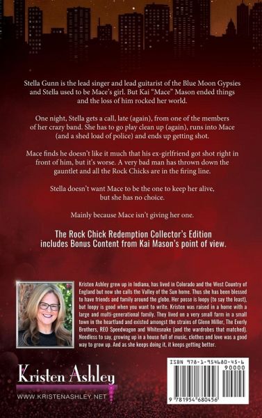 Stella Gunn is the lead singer and lead guitarist of the Blue Moon Gypsies and Stella used to be Mace's girl. But Kai "Mace" Mason ended things and the loss of him rocked her world. One night, Stella gets a call, late (again), from one of the members of her crazy band. She has to go play clean up (again), runs into Mace (and a shed load of police) and ends up getting shot. Mace finds he doesn't like it much that his ex-girlfriend got shot right in front of him, but it's worse. A very bad man has thrown down the gauntlet and all the Rock Chicks are in the firing line. Stella doesn't want Mace to be the one to keep her alive, but she has no choice. Mainly because Mace isn't giving her one. The Rock Chick Redemption Collector's Edition includes Bonus Content from Kai Mason's point of view.