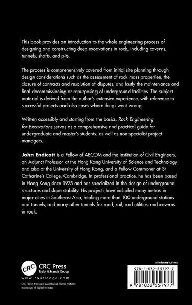 1. Excavations in Rock. 2. Site Characterization. 3. Rock Mass Properties. 4. Design Principles and Methods. 5. Design of Rock Slopes and Shafts. 6. Design of Components. 7. Excavation Methods. 8. Permits Form of Contract Tendering. 9. Site Establishment Contract administration Operation and Maintenance.