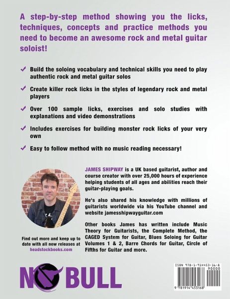 Learn the rock licks, techniques and concepts you need to become an awesome rock and metal guitar soloist with this easy-to-follow, step-by-step method! No music reading necessary plus over 75 minutes of supporting video lessons and demonstrations and over 50 minutes of backing tracks in a variety of rock styles. Build the soloing vocabulary and technical skills you need to play authentic rock and metal guitar solos Over 100 sample licks and exercises based on the playing of legendary guitarists like Jimi Hendrix, Jimmy Page, Angus Young, Michael Schenker, Tony Iommi, Ritchie Blackmore, Gary Moore, Randy Rhoads, Zakk Wylde, Kirk Hammett, Slash, Paul Gilbert, George Lynch, Warren DeMartini and others Learn essential blues-rock licks, repeating licks, 'sliding scale' licks, double-stop licks, legato licks and more Learn and understand essential rock scales like the minor pentatonic, blues scale, major pentatonic, natural minor scale and Dorian mode Nail essential rock techniques like string bending, 'wide' rock vibrato, muting and string damping, pinch harmonics, 'hammering-from-nowhere' and others Discover how to put it all together into solos that make an impact by exploring techniques like repetition, contrast, phrasing, dynamics etc. Includes lessons on how to practice, building speed with a metronome,'speed learning' techniques for faster memorisation of new material, different bending techniques (pre-bends, repicked bends etc), amp setting guidelines, basic rhythm reading and more Easy to follow method with no music reading necessary! This is more than just another 'book of licks'! It literally gives you a step-by-step method for building a soloing vocabulary like the one all the great rock players have. This can potentially transform your playing and get you playing authentic rock solos with more fluency and authority than you perhaps thought possible. Rock Lick Method for Guitar also comes with an optional free download pack containing over 75 minutes of video tuition/demonstration of the material in the book, over 20 authentic rock backing tracks plus a blank tab workbook/practice diary to use alongside the method. Rock Lick Method for Guitar is perfect for: Rock players who wants to massively expand their soloing vocabulary and their repertoire of licks and techniques Players from other styles (blues, country etc.) who want to build their rock guitar skills Players who are sick and tired of playing the same licks and need some fresh ideas! Intermediate players looking to level up their playing Intermediate-advanced players looking for inspiration and ideas so they can build on their existing skills Who is this book NOT for? This book is not really aimed at the complete beginner, some experience and ability playing licks and solos is preferable This book is not aimed at someone looking for a library of 'shred' licks using sweep picking, tapping etc. These advanced playing techniques are not covered
