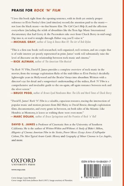 * Contents * 1. Introduction: Rock 'n' Film * 2. Absolute Beginnings: Blackboard Jungle * 3. Jukebox Musicals * 4. Dirty Stars: Jayne Mansfield and Kenneth Anger * 5. Rock 'n' Roll Noir: Elvis Before the Army * 6. Sunshine Elvis: The Devil in Disguise * (inc Morphology of the Elvis Movie) * 7. Back in the UK: The English Elvises * 8. Beatles I: Richard Lester and A Hard Day's Night * 9. Beatles II: Next Morning * 10. Bringing It All Back Home: Toward the Folk Documentary * 11. D. A. Pennebaker: Documentary from Folk to Folk Rock and Rock * 12. Utopia and Its Discontents: Woodstock * 13. The Rolling Stones I: The Greatest Rock 'n' Film Band in the World * 14. Mick Jagger, Demon Brother * 15. The Rolling Stones II: The U.S. Tours, From Concert Film to Film Concert: * 16. Back To Black . . . : Soul * 17. . . . And White: Country * 18. Retrospection and Reflexivity: Rock 'n' Film Suicide * Index