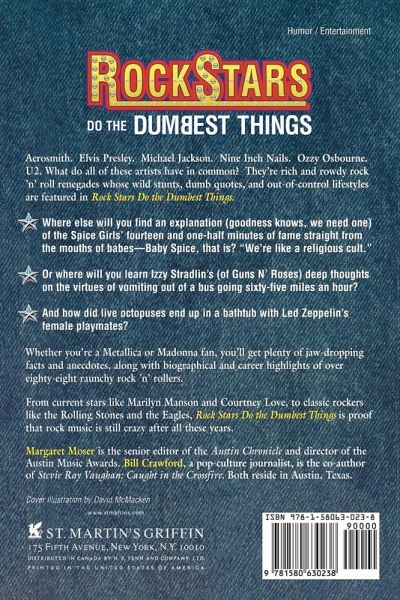 Aerosmith. Elvis Presley. Michael Jackson. Nine Inch Nails. Ozzy Osbourne. U2. What do all of these artists have in common? They're rich and rowdy rock 'n' roll renegades whose wild stunts, dumb quotes, and out-of-control lifestyles are featured in Rock Stars Do the Dumbest Things. --Where else will you find an explanation (goodness knows, we need one) of the Spice Girls' fourteen and one-half minutes of fame straight from the mouths of babes--Baby Spice, that is? "We're like a religious cult." --Or where will you learn Izzy Stradlin's (of Guns N' Roses) deep thoughts on the virtues of vomiting out of a bus going sixty-five miles an hour? --And how live octopuses end up in a bathtub with Led Zepplin's female playmates? Whether you're a Metallica or Madonna fan, you'll get plenty of jaw-dropping facts and anecdotes, along with biographical and career highlights of over eighty-eight raunchy rock 'n' rollers. From current starts like Marilyn Manson and Courtney Love, to classic rockers like the Rolling Stones and the Eagles, Rock Stars Do the Dumbest Things is proof that rock music is still crazy after all these years.