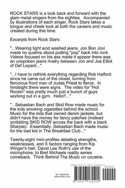 ROCK STARS is a look back and forward with the glam metal singers from the eighties. "...Wearing tight acid washed jeans, Jon Bon Jovi made no qualms about putting "pop" back into rock. Videos focused on his ass made it appear there was an unspoken jeans rivalry between Jon and Joe Elliot of Def Lepard..." "...In hindsight there were signs Rob Halford was gay. The video for "Hot Rockin" was pretty much just a bunch of guys working out in a gym. Hello!!..." "...Sebastian Bach and Skid Row made music for the kids smoking cigarettes behind the school. Essentially, Sebastian Bach made music for the bad kid in The Breakfast Club..." Twenty-eight mini-profiles detailing strengths, weaknesses, and X factors ranging from Kip Winger's hair, David Lee Roth's use of the microphone, to Bret Michaels reality series comeback. Think Behind The Music on cocaine.