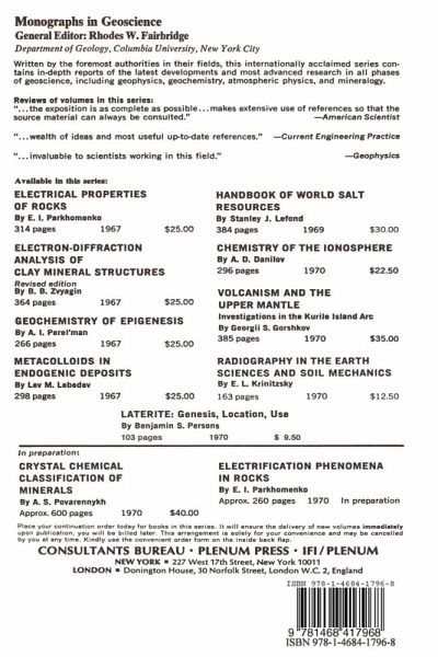1. The Earth's Crust.- 1-1. Rocks and Minerals.- 1-2. Disequilibrium and Equilibrium.- 1-3. Alteration of Original Rocks by Weathering.- 2. The Weathering Environment.- 2-1. Fundamental Processes.- 2-2. Climate and Microclimate.- 2-3. The Five Variables of Weathering.- 2-4. The Steady State in Weathering.- 3. Geochemical and Pedochemical Weathering.- 3-1. Saprolites.- 3-2. Soils.- 4. Soil.- 4-1. Soil as an Entity.- 4-2. Soil Profiles.- 4-3. Mineral Products of Weathering.- 4-4. Residual Minerals of Weathering.- 4-5. Clay Minerals.- 5. Soil Patterns.- 5-1. Present-Day Soils.- 5-2. Classification of Soils.- 5-3. Soils of the United States.- 5-4. Lateritic Soils, Laterite, and Bauxite.- 5-5. Volcanic Ash.- 5-6. Loess.- 5-7. Sands.- 5-8. Alluvial Soils.- 6. Amount of Chemical Weathering.- 6-1. Calculating the Amount of Chemical Weathering.- 6-2. Barth's Calculations.- 6-3. Calculations from Chemical Analyses.- 6-4. Calculations from Mineralogical Analyses.- 6-5. Calculating the Amount of Clay Developed.- 7. Physical Weathering.- 7-1. Mechanical Disintegration.- 7-2. Primary Breakdown into Grains.- 7-3. Effect of Particle Size on Weathering Processes.- 7-4. Grain Sizes in Soils.- 8. Chemical Weathering.- 8-1. Weathering by Water.- 8-2. Kinds of Water in Weathering.- 8-3. Solution.- 8-4. Hydrolysis.- 8-5. Ion Exchange.- 8-6. Oxidation and Reduction.- 9. Biological Acivity in Weathering.- 9-1. Role of Plants and Animals.- 9-2. Ecology and Climatic Pattern.- 9-3. Organic Matter and the Formation of Humus.- 9-4. Humus in Soil Formation.- 9-5. Complexing and Chelation (Chevulation).- 9-6. Organic Weathering.- 10. Temperature in Weathering.- 10-1. Weathering Temperatures.- 11. Time in Weathering.- 11-1. Duration of Weathering Period.- 11-2. Pedological Indication of Time.-11-3. Fossil Soils.- 12. Trace Elements in Weathering.- 12-1. Amounts of Trace Elements in Rocks in the Lithosphere.- 12-2. Association with Minerals.- 12-3. Distribution in Granitic and Basaltic Rocks.- 12-4. Chemical Characteristics.- 12-5. Behavior of Trace Elements in Weathering.- 12-6. Petrographic and Biogeochemical Provinces.- 12-7. Relationship of Trace Elements to Plant and Animal Nutrition.- 12-8. Relationship of Trace Elements to Human Nutrition.- Appendix 1. Mineral Transformations in Weathering.- Appendix 2. Data of Rock Weathering.- Literature Cited.