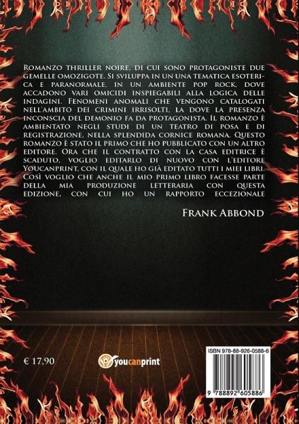 Romanzo Thriller Noire, di cui sono protagoniste due gemelle omozigote. Si sviluppa in una tematica esoterica e paranormale, in un ambiente pop rock, dove accadono vari omocidi inspiegabili alla logica delle indagini. Fenomeni anomali che vengono catalogati nell'ambito dei crimini irrisolti, là dove la presenza inconscia del demonio fa da protagonista. Il romanzo è ambientato negli studi di un teatro di posa e di registrazione, nella splendida cornice romana.