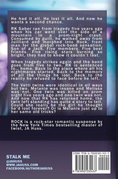He had it all. He lost it all. And all he wants now is a second chance. RK Saber ran from tragedy five years ago when his car went over the side of a mountain in a prom-night crash. Consumed by guilt, he walked away from Juilliard and morphed into Rock, front man for the global rock-band sensation, Son of a Jack. Five members. Five best friends. Five rising stars burning so bright, they had to know it couldn't last. When tragedy strikes again and the band goes from five to two, RK is sentenced to... home. Back to the place where all his nightmares started. Back to the memory of all the things he lost. Back to the reality he refused to face before he left. The Vetti twins were identical in all ways but two. Melanie was insane and Melissa was not. One twin was killed on prom night five years ago and one twin was not. And now that RK has returned home, the twin left standing has quite a story to tell. Could she really be the girl he thought he'd lost forever? Or is Melanie just up to her same old tricks? ROCK is a rock-star romantic suspense by the New York Times bestselling master of twist, JA Huss.