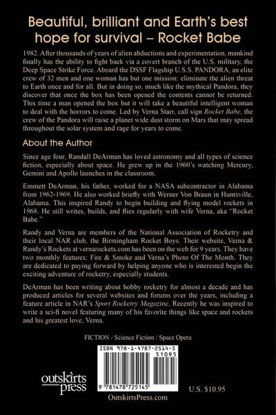 1982. After thousands of years of alien abductions and experimentation, mankind finally has the ability to fight back via a covert branch of the U.S. military, the Deep Space Strike Force. Aboard the DSSF Flagship U.S.S. PANDORA, an elite crew of 32 men and one woman has but one mission: eliminate the alien threat to Earth once and for all. But in doing so, much like the mythical Pandora, they discover that once the box has been opened the contents cannot be returned. This time a man opened the box but it will take a beautiful intelligent woman to deal with the horrors to come. Led by Verna Starr, call sign Rocket Babe, the crew of the Pandora will raise a planet wide dust storm on Mars that may spread throughout the solar system and rage for years to come.