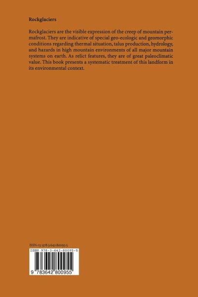 Rockglaciers are the visible expression of the creep of mountain permafrost. They are indicative of special geo-ecologic and geomorphic conditions regarding thermal situation, talus production, hydrology, and hazards in high mountain environments of all major mountain systems on earth. As relict features, they are of great paleoclimatic value. This book presents a systematic treatment of this landform in its environmental context.