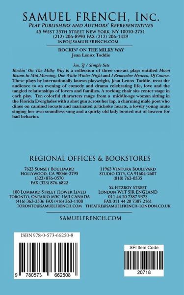 3m, 7f / Simple Sets Rockin' On The Milky Way is a collection of three one-act plays entitled Moon Beams In Mid-Morning, One White Winter Night and I Remember Heaven, Of Course. These plays by internationally known playwright, Jean Lenox Toddie, treat the audience to an evening of comedy and drama celebrating life, love and the tangled relationships of lovers and families. A rocking chair sits center stage in each play. Ten colorful characters range from a middle-age woman sitting in the Florida Everglades with a shot gun across her lap, a charming male poet who dines on candied locusts and marinated artichoke hearts, a lovely young mute singing her own soundless song and a quirky old lady booted out of heaven for bad behavior.