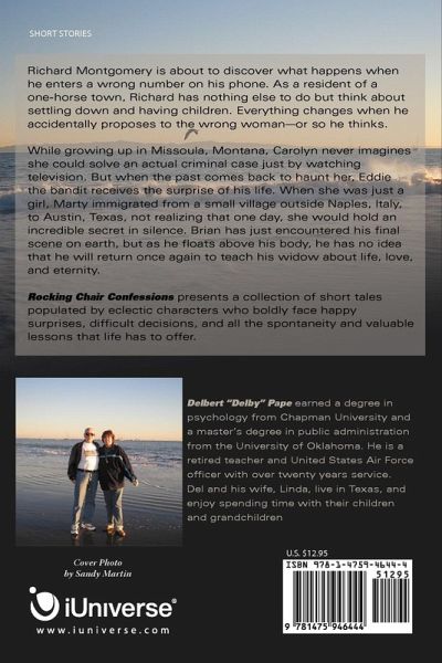 Richard Montgomery is about to discover what happens when he enters a wrong number on his phone. As a resident of a one-horse town, Richard has nothing else to do but think about settling down and having children. Everything changes when he accidentally proposes to the wrong woman-or so he thinks. While growing up in Missoula, Montana, Carolyn never imagines she could solve an actual criminal case just by watching television. But when the past comes back to haunt her, Eddie the bandit receives the surprise of his life. When she was just a girl, Marty immigrated from a small village outside Naples, Italy, to Austin, Texas, not realizing that one day, she would hold an incredible secret in silence. Brian has just encountered his final scene on earth, but as he floats above his body, he has no idea that he will return once again to teach his widow about life, love, and eternity. Rocking Chair Confessions presents a collection of short tales populated by eclectic characters who boldly face happy surprises, difficult decisions, and all the spontaneity and valuable lessons that life has to offer.
