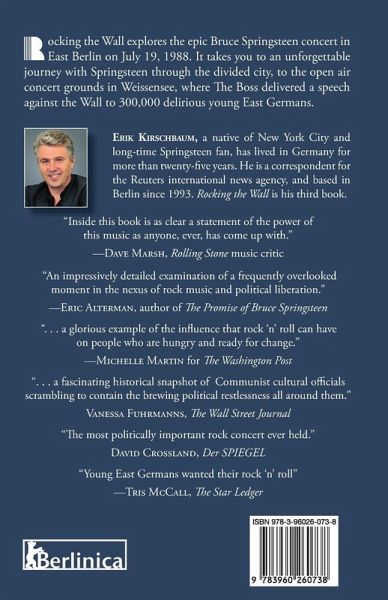 Rocking the Wall explores the epic Bruce Springsteen concert in East Berlin on July 19, 1988, and how it changed the world. Erik Kirschbaum spoke to scores of fans and concert organizers on both sides of the Berlin Wall, including Jon Landau, Springsteen's long-time friend and manager, to unearth this fascinating story. With lively behind-the-scenes details from eyewitness accounts, magazine and newspaper clippings, TV recordings, and even Stasi files, as well as photos and memorabilia, this gripping book transports you back in the middle of those heady times shortly before the Berlin Wall fell and gives you a front-row spot at one of the biggest and most exciting rock concerts ever, anywhere. It takes you to an unforgettable journey with Springsteen through the divided city, to his hotel, and his dressing room at the open air concert grounds in Weissensee, where The Boss, live on stage, delivered a courageous speech against the Wall to a record-breaking crowd of more than 300,000 delirious young East Germans full of joy and hope. Their thunderous reaction to his speech was so intense that it even briefly brought tears to Springsteen's eyes. And their tremendous, powerful cry for freedom became the "final nail in the coffin" of the Communist regime and subsequently helped fuel the uprising that brought down the Wall. Inside this book is as clear a statement of the power of this music as anyone, ever, has come up with." -Dave Marsh, Rolling Stone music critic "An illuminating and impressively detailed examination of a frequently overlooked moment in the nexus of rock music and political liberation. I learned a great deal and enjoyed doing so." -Eric Alterman, author of It Ain't No Sin to Be Glad You're Alive: The Promise of Bruce Springsteen Berlinica Publishing LLC offers English-language books from Berlin, German; fiction, non-fiction, travel guides, history about the Wall and the Third Reich, Jewish life, art, architecture and photography, as well as travel guides and cookbook. It also offers documentaries and feature films on DVD, as well as music CDs. Berlinica caters to history buffs, Americans of German heritage, travelers, and artists and young people who love the cutting-edge city in the heart of Europe. Berlinica cooperates with Berlin-based publishing houses. Berlinica's current and upcoming titles include "Our West Berlin," by various authors, also five translated books by famed Weimar author Kurt Tucholsky as well as Harold Poor's landmark biography of Tucholsky, two translated plays by Ernst Toller, and two American travel stories by Alfred Kerr and Roda Roda, soon to be followed by Egon Erwin Kisch's "Paradise America". In the non-fiction department, we have "Rocking the Wall," the Bruce-Springsteen-book and "Burning Beethoven," about German Americans in World War I, both by Erik Kirschbaum, also "Mark Twain in Berlin," by Andreas Austilat, "Berlin 1945: World War II: Photos of the Aftermath," by Michael Brettin, "The Berlin Wall Today," a full-color guide to the remnants of the Wall, by Michael Cramer, "Berlin in the Cold War," about post-World War II history, the comprehensive guide "Jews in Berlin," by Andreas Nachama, Julius Schoeps, Hermann Simon, and "A Place they Called Home," edited by Donna Swarthout about Jews returning to Germany. We also offer "The Berlin Cookbook," a full-color collection of traditional German recipes by Rose Marie Donhauser, the picture book "Wings of Desire," by Lothar Heinke, "Martin Luther's Travel Guide," by Cornelia Dömer, "Leipzig! The City of Books und Music," by Sebastian Ringel, and "Berlin For Free," a guide for the frugal traveler by Monica Maertens.