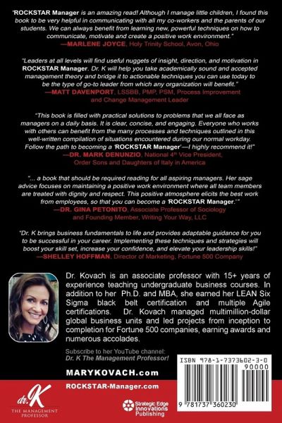 Dr. Mary Kovach is an associate professor with more than 15 years of undergraduate teaching experience. She earned her Ph.D., MBA, and Bachelor's degrees in business. Additionally, Dr. Kovach earned a LEAN Six Sigma black belt (LSSBB) certification as well as multiple Agile certifications. She had 15 years of demonstrated career growth and earned a variety of management awards at Fortune 500 companies, managing multimillion-dollar global business units and leading projects from inception to completion. Dr. Kovach is published in various scholarly journals and magazines and is also a blind peer reviewer to a variety of scholarly/academic journals. Furthermore, she was named to the International Editorial Board for The Journal of Values Based Leadership. Dr. Kovach has her own YouTube channel entitled Dr. K - The Management Professor, where her show ROCKSTAR Manager initially aired on the In the Limelight TV channel on Binge Networks. Lastly, Dr. Kovach authored two other books including ROCKSTAR Manager: From Theory to Practice (Foreword by Rocco DiSpirito), #MINDSET: A Research-Based Approach to Understanding Motivation (Foreword by Sir Aaron Caruso), Be Your Best You: The Ultimate Research-Based Guide to Outstanding Leadership (Foreword by John Di Domenico), and with her cousins, Don't Cut the Basil: Five Generations of Authentic Italian Recipes (Foreword by Ale Gambini), which is a #1 international best-selling cookbook (CugineInCucina.com).